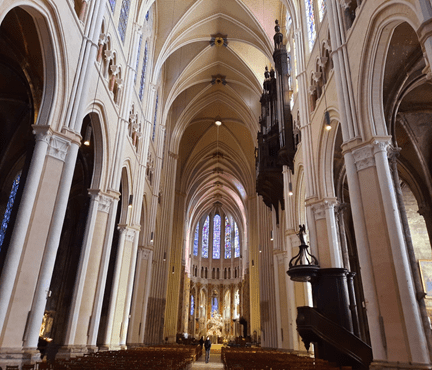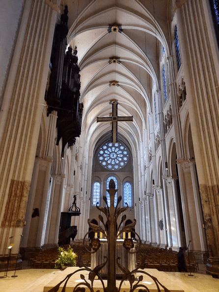 Externamente, o fato de que suas duas torres são completamente diferentes entre si foi o que mais chamou minha atenção. Gera um pouco de incômodo inicial, porque sempre se espera equilíbrio na arquitetura gótica, mas, depois, a gente assimila como um charme adicional.