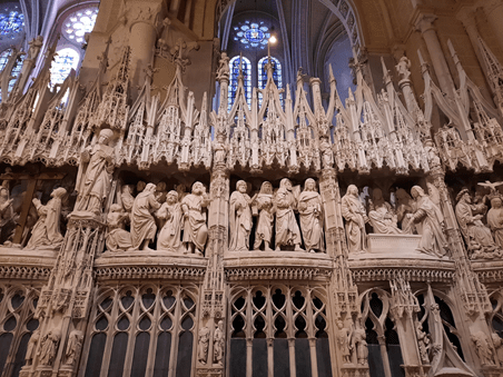 Os vitrais são, de fato, lindíssimos, mas a mim chamam mais atenção as esculturas em alto relevo que ornam paredes internas e externas. Fico imaginando o tempo necessário para aque, a partir de uma rocha matriz, muitos homens dias e dias esculpirem estátuas e arabescos conformaram paredes imensas, tanto externas como internas, marcadas por um efetivo rendilhado, que me fazem agora ficar de boca aberta. Teria passado pela cabeça deles há mais de oito séculos, a quantas pessoas encantariam com seu trabalho? Provavelmente não, mas encantam!