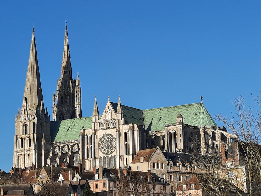 Falar em Chartres significa, imediatamente, remeter à sua catedral que, ao lado das catedrais de Reims e Amiens, é um grande símbolo da arquitetura gótica na França. Seu nome oficial é Cathédrale Notre-Dame de Chartres e já tem mais de 800 anos. Sua construção teve início em 1145 e foi concluída em 1221, mas teve que ser reconstruída após ter sofrido um incêndio em 1194. Tem mais de 10 mil m2 e sua inigualável nave central tem 130 m de comprimento, atingindo essa nave 37 m de altura, que impressiona ao lembrarmos que isso foi feito apenas com o cálculo da justaposição das pedras, visto que não havia concreto armado, tampouco se utilizava ferro fundido em construções.