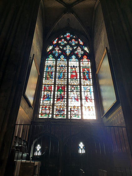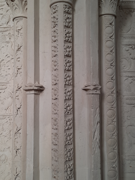 Os vitrais são, de fato, lindíssimos, mas a mim chamam mais atenção as esculturas em alto relevo que ornam paredes internas e externas. Fico imaginando o tempo necessário para aque, a partir de uma rocha matriz, muitos homens dias e dias esculpirem estátuas e arabescos conformaram paredes imensas, tanto externas como internas, marcadas por um efetivo rendilhado, que me fazem agora ficar de boca aberta. Teria passado pela cabeça deles há mais de oito séculos, a quantas pessoas encantariam com seu trabalho? Provavelmente não, mas encantam!