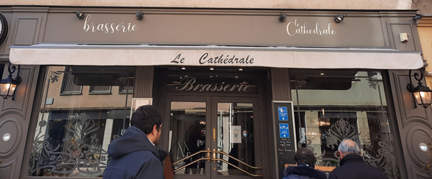 Se quiser uma dica de restaurante, com boa relação custo x benefício, sugiro a Brasserie Le Cathédrale. Achamos esquisito porque cathédrale, em francês como em português, é uma palavra feminina e seria La Cathédrale, mas enfim aí está a fachada dele.