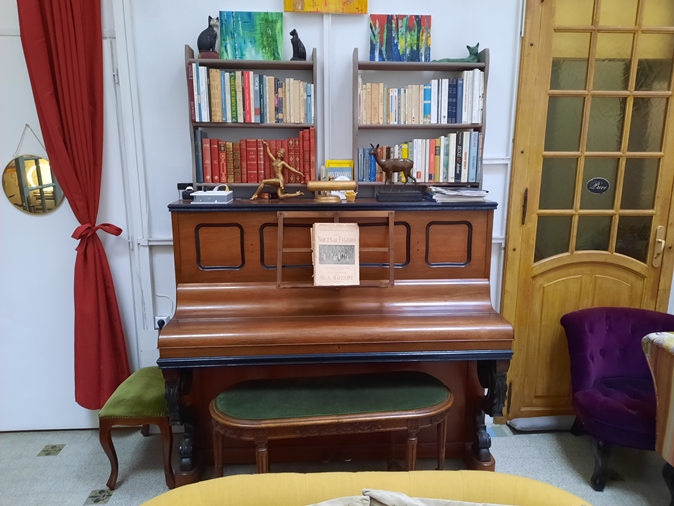 Os pequenos sofás acomodados na sala do fundo, tanto quanto as poltronas que ladeiam as mesinhas da primeira sala convidam à permanência. Um piano, pequenas escrivaninhas e mesinhas compõem o conjunto, com tantos objetos que teríamos distração para muitas horas se quiséssemos observar o valor histórico ou o charme de cada um.