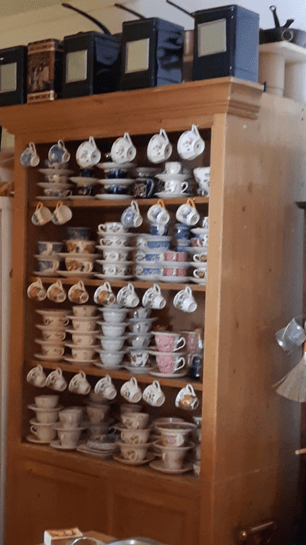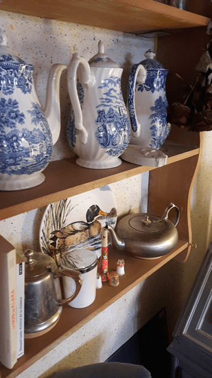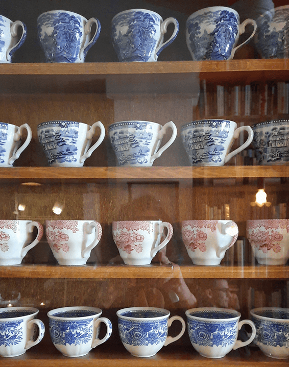 Os móveis nos quais as louças estão expostas não tem nada de muito especial, mas compõem com elas um conjunto que remete ao passado, ao mesmo tempo em que traz uma boa sensação de conforto.