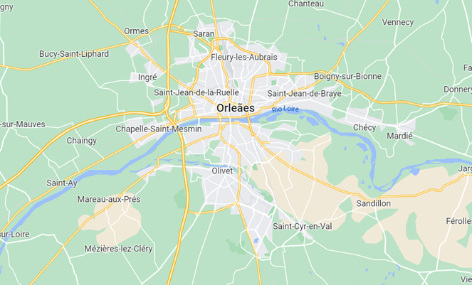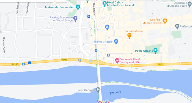 A rue Royale é a principal e liga o centro de Orleans ao rio Loire, que banha a cidade e a divide em duas. O primeiro mapa dá uma visão de conjunto urbano e o zoom do segundo possibilita ver essa rua em continuidade à ponte.