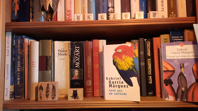 Havia publicações de todo tipo. Virei o rosto para o alto, logo ao lado da mesa onde ficamos, e encontrei Mozart ao lado de Gabriel Garcia Marques, e ali estava justamente o meu livro preferido: Cem Anos de Solidão.