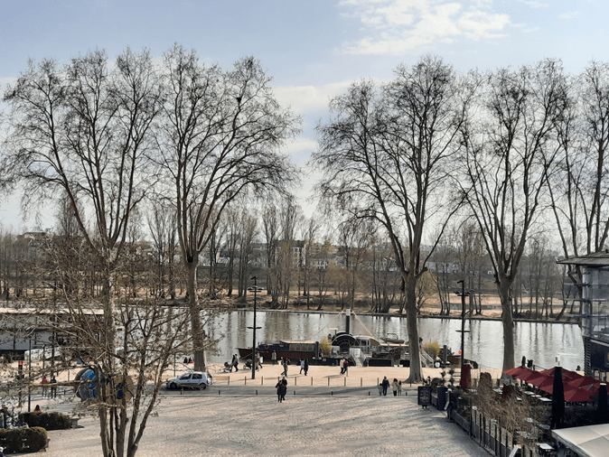 Caminhando às margens do rio, demos boas-vindas ao sol que pouco depois das 13h revolveu dar as caras, o que tirou os moradores de dentro de casa. Ficamos lamentando que não haja tantas intervenções urbanas, com a construção de calçadões e a instalação de bancos e luminárias, ao longo de nossos rios, no Brasil. Seria ótimo, pois favoreceria esses tipos de passeio. É muito bom ver os moradores se apropriando desses espaços. Havia gente de todas as idades e de nacionalidades diferentes como os biotipos denotavam. Alguns de patinete ou skate, outros de bike, a maioria a pé, como nós.