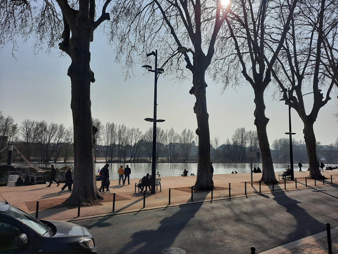 Ao meu lado estava a informação, numa plaquinha, que o estabelecimento estaria aberto 7/7 jours, ou seja, todos os dias da semana, das 13h às 20h. Continuamos a caminhada pela rue Royale, considerada a mais bonita de Orleans (cujos edifícios têm suas arcadas, cobrem as calçadas e mostram suas vitrines bem arrumadas), até chegar ao rio Loire. Aventamos a hipótese de voltar mais tarde, mas sem grande convicção.
