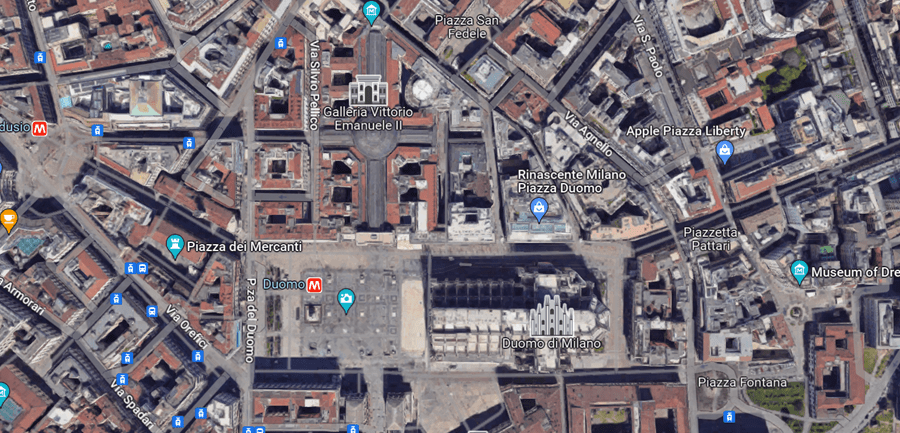 Na piazza há uma estação de metrô e quase nenhum outro obstáculo que sirva de anteparo à nossa visão sobre uma das entradas da Galleria, ao norte, e sobre a catedral a leste da praça.