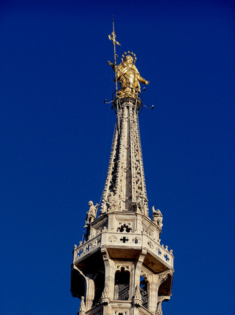Nos folhetos que orientam os visitantess, há informações de que ela tem três mil estátuas entre as externas e as internas. Um dos seus ícones está na sua torre mais alta – a Madonina – uma Nossa Senhora toda dourada que é o ponto mais alto do centro de Milão, não podendo nenhum edifício, nesta área, ultrapassar sua altura.