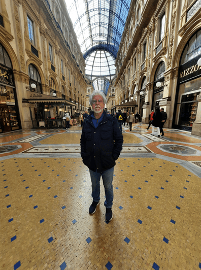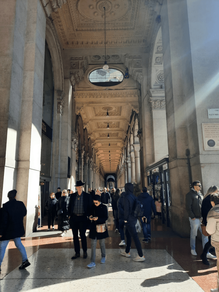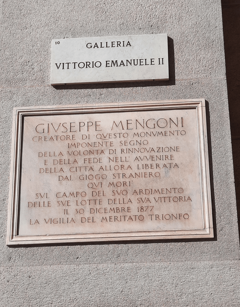 A sua construção decorreu de um concurso público para o projeto de uma galeria que fizesse a ligação entre Il Duomo e a praça onde está o Teatro alla Scala de Milão (Fonte: https://www.milaonasmaos.it/10-curiosidades-sobre-a-galeria-vittorio-emanuele/). Quem venceu foi o engenheiro Giuseppe Mengoni, a quem a placa, ao lado do seu portal principal, memoriza e agradece. Li, neste mesmo site, que ele caiu de um andaime e faleceu na véspera de inauguração da galeria que projetou. Que trágico!