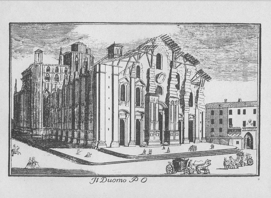 Em meados do século XVIII, a fachada do Duomo se apresentava como na figura subsequente. Observando a imagem é possível notar que ela cresceu e se embelezou muito nos dois séculos seguintes, pois se ela foi considerada finalizada em 1813, continuou a conhecer mudanças, como suas portas que foram trocadas e está constantemente em manutenção. Basta buscar imagens dela no Google e se percebe que há fotos em que a fachada aparece em diferentes tons, dependendo da proximidade maior ou menor dos anos em que passou por limpeza.