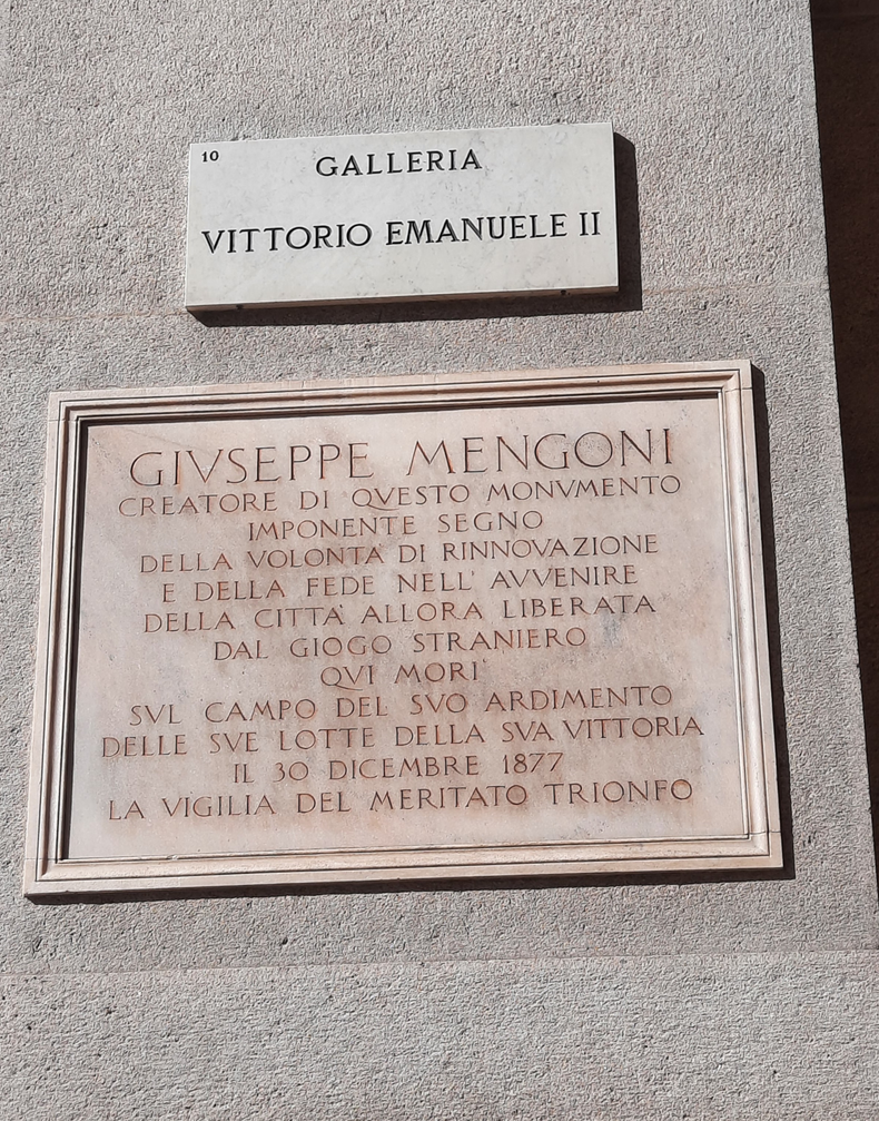 A sua construção decorreu de um concurso público para o projeto de uma galeria que fizesse a ligação entre Il Duomo e a praça onde está o Teatro alla Scala de Milão (Fonte: https://www.milaonasmaos.it/10-curiosidades-sobre-a-galeria-vittorio-emanuele/). Quem venceu foi o engenheiro Giuseppe Mengoni, a quem a placa, ao lado do seu portal principal, memoriza e agradece. Li, neste mesmo site, que ele caiu de um andaime e faleceu na véspera de inauguração da galeria que projetou. Que trágico!