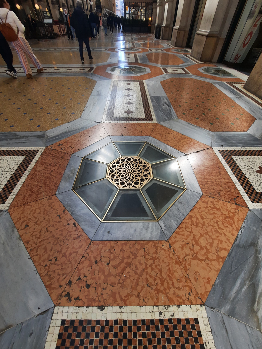Estas duas fotos possibilitam observar a delicadeza do mosaico que compõe o piso da galeria – ele é lindo! Veja os detalhes na próxima foto.