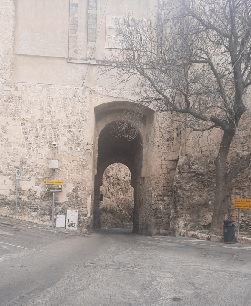 Voltando ao Distrito do Castello, informo que, ainda hoje, para se circular a pé ou de carro pela zona é necessário entrar pelas portas que, no passado, tiveram a função de proteger a cidade e controlar a circulação de mercadores. Hoje, o fluxo que as atravessa é mediado por um semáforo, pois o tamanho é suficiente para a passagem de, apenas, um veículo…. Assim, ficamos nós com nosso mini Mini, locado para circular pela ilha, aguardando o verde aparecer para entrar na guest house, em que nos hospedaríamos, localizada justamente intramuros. Quando fiz a reserva pelo Booking.com, não podia imaginar a escolha que fizemos: ótima do ponto de vista de conhecer bem esse centro histórico, um pouco difícil, por outro lado, porque para se aceder à zona comercial atual da cidade, onde estão a maior parte dos bares e restaurantes e parte do patrimônio constituído por várias igrejas, era preciso vencer a pé muitas ladeiras e degraus (demoramos um pouco para descobrir que há elevadores públicos que ajudam bastante a vencer os enormes desníveis).
