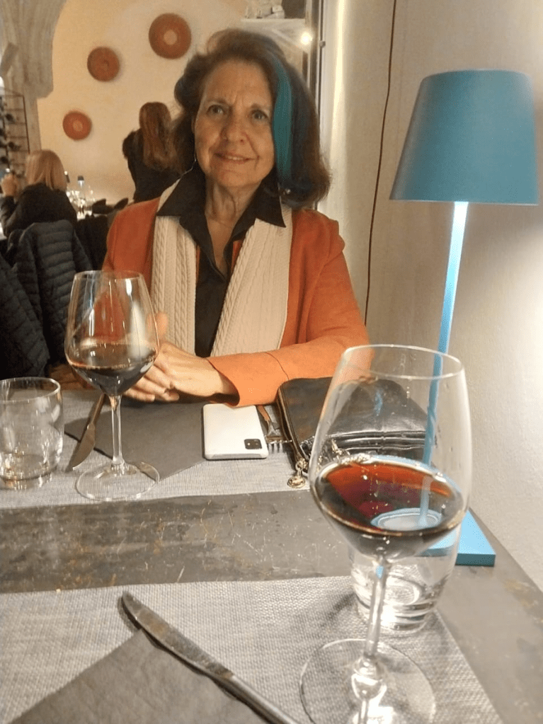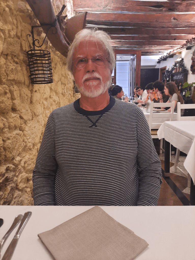 Foi caminhando em busca da cidade baixa, digamos assim, que vimos L’Osteria di Castello, um simpático restaurante ao qual se tem acesso após descer alguns degraus, para se chegar ao piso que deve ter sido, no passado, um porão, o que lhe dava a aparência de uma pequena caverna (veja, leitor, nas fotos, suas paredes seculares e a madeira que sustenta os andares superiores). Ali o perfume dos temperos da cozinha, as toalhas e guardanapos absolutamente brancos e, na sequência, uma boa taça de tinto agradam o corpo cansado do sobe e desce, imposto pelos desníveis, e aquecem o coração.