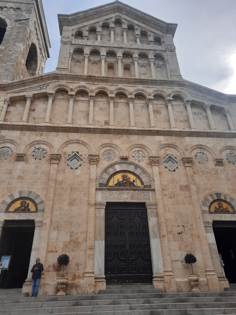 Como assinalado nos mapas, é no Distrito do Castello que está a catedral de Cagliari. Uma igreja bonita por fora, por ter sido erguida com a rocha calcária que domina a região e dá a sua fachada esta claridade que embeleza a composição e favorece o destaque das colunas e do dourado que emoldura as imagens santas. Com a torre iluminada à noite, achei que fica ainda mais bonita.