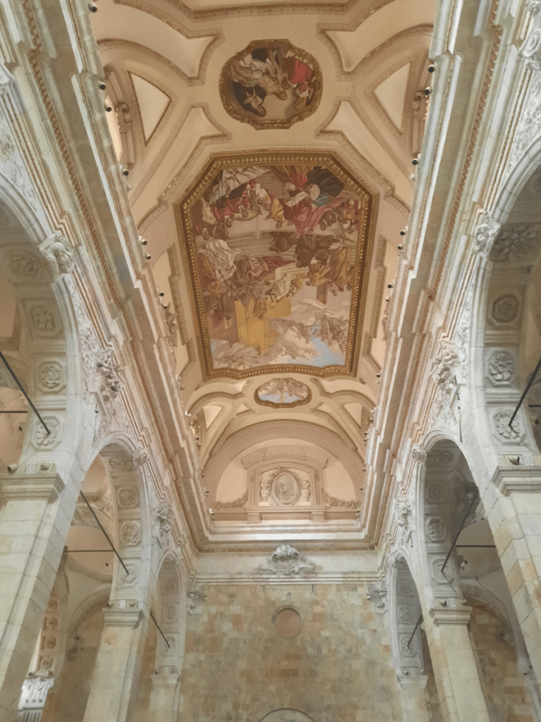 O teto também é lindo e os altares secundários nas laterais merecem igualmente destaque.