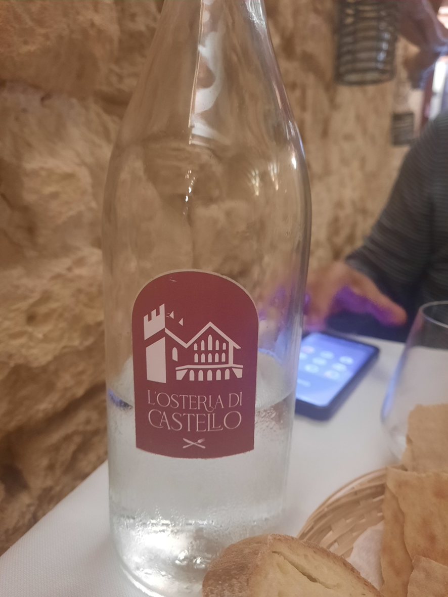 Foi caminhando em busca da cidade baixa, digamos assim, que vimos L’Osteria di Castello, um simpático restaurante ao qual se tem acesso após descer alguns degraus, para se chegar ao piso que deve ter sido, no passado, um porão, o que lhe dava a aparência de uma pequena caverna (veja, leitor, nas fotos, suas paredes seculares e a madeira que sustenta os andares superiores). Ali o perfume dos temperos da cozinha, as toalhas e guardanapos absolutamente brancos e, na sequência, uma boa taça de tinto agradam o corpo cansado do sobe e desce, imposto pelos desníveis, e aquecem o coração.