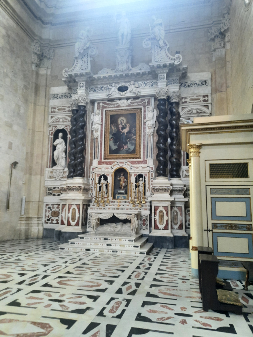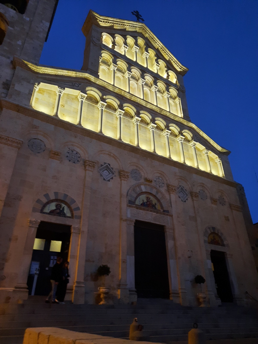 Como assinalado nos mapas, é no Distrito do Castello que está a catedral de Cagliari. Uma igreja bonita por fora, por ter sido erguida com a rocha calcária que domina a região e dá a sua fachada esta claridade que embeleza a composição e favorece o destaque das colunas e do dourado que emoldura as imagens santas. Com a torre iluminada à noite, achei que fica ainda mais bonita.