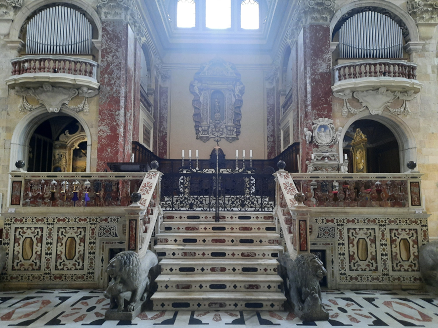 Por dentro, encanta igualmente, talvez porque, não tendo vitrais coloridos, a transparência dos vidros deixa a luz entrar livremente. Deduzi que os vitrais se perderam em ataques que a cidade sofreu durante a segunda Guerra Mundial, quando foi bombardeada em 1943. O altar é demarcado por escada e muretas de mármore e granito trabalhadas maravilhosamente, conformando verdadeiros rendilhados. Dois leões de bronze resguardam a entrada.