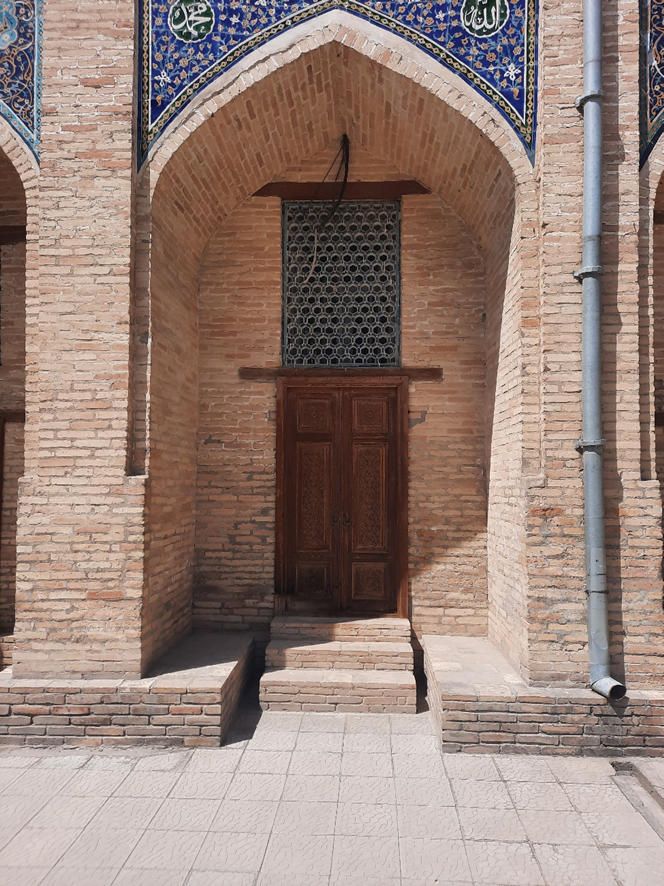 Em Khaste Imon, visitamos a madraça Kafal Shohi. Na foto, com um zoom, você poderá ver, nas paredes de tijolos: – os originais que tem um tom pouco mais escuro; – os que foram adicionados para recompor as edificações, que são mais claros e homogêneos.