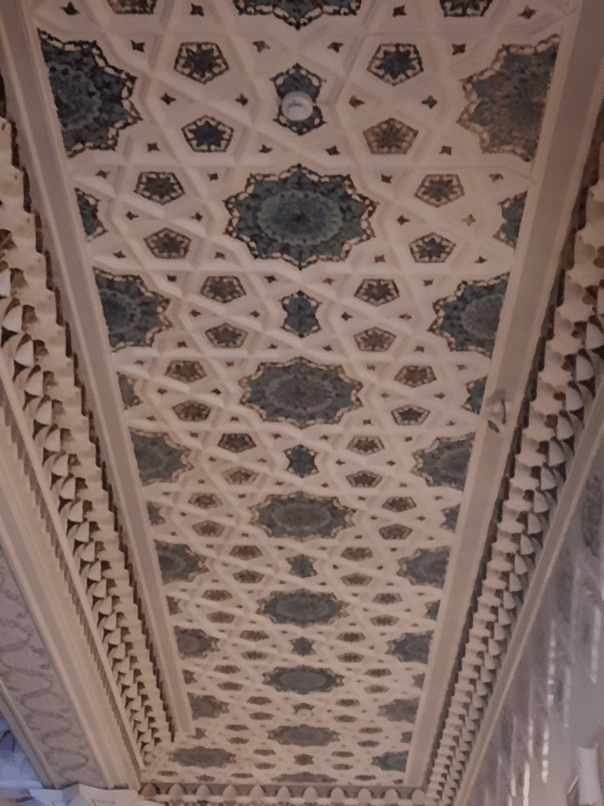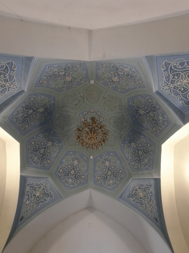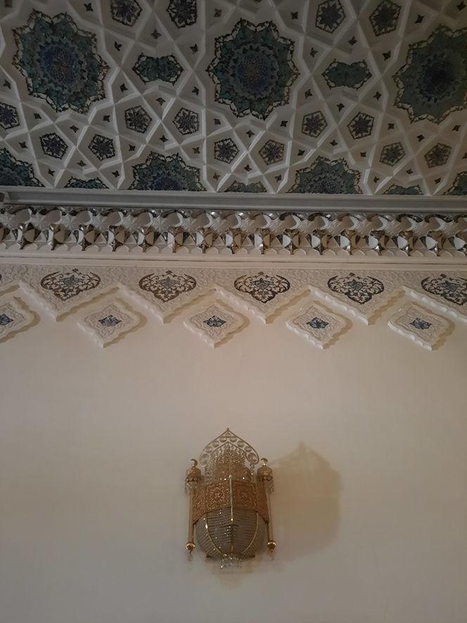 Neste mausoléu, está exposto um livro com o Alcorão, o Usamna Qur’na, original do século VII. As páginas são feitas de pele de carneiro e ele está protegido por um vidro para mantê-lo em condições térmicas estáveis. Não há autorização, sequer, para fotografar o documento histórico, mas sinceramente o que me interessou mesmo foi a decoração do pequeno ambiente.