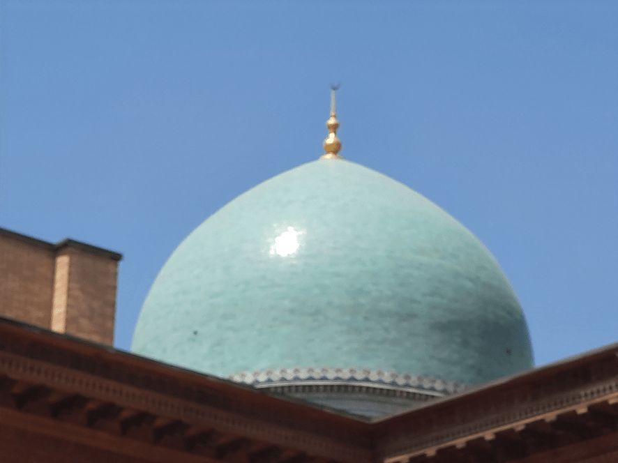 A arquitetura histórica aqui do Uzbequistão me agrada muito, porque é linda a combinação entre os tijolos à vista, os azuis e os verdes dos azulejos que adornam fachadas e cúpulas, com toques de dourado. Os tijolos à vista são de uma cor mais amena, que os avermelhados que temos no Brasil, um tom entre o ocre claro e o acinzentado, em função da semi-aridez do clima da Ásia Central.
