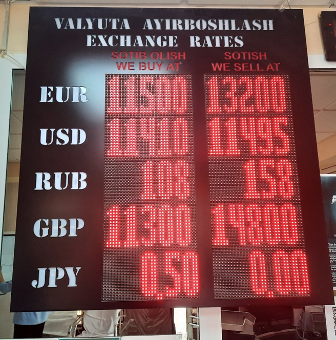 Nas ruas do bairro judeu, concentram-se as atividades bancárias, de produção artesanal e o comércio da Bukhara turística. Desde agências e caixas onde se pode trocar dólares ou Euros por Som Uzbeque (UZS), passando por pequenas lojas onde se vendem tesouras, facas, pratos de outros produtos de metal trabalhado, por lojas de tapetes de vários tipos, por ateliês de pintura a mão, em que os artistas produzem e vendem seus produtos. Com uma pequena cifra em dólares, você sai com o bolso cheio de Sons. Será que é assim mesmo que se escreve o plural da moeda uzbeque?