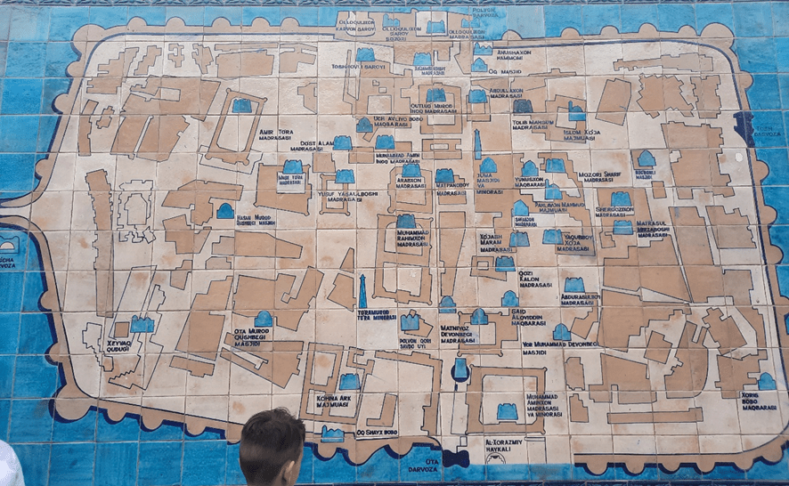 Começamos o percurso pelo grande painel, em que com os mesmos tipos de azulejo que utilizam para as mais lindas decorações uzbeques, eles representaram o mapa da cidade histórica. O difícil foi conseguir fazer uma fotografia sem que houvesse uma cabeça na frente dele.