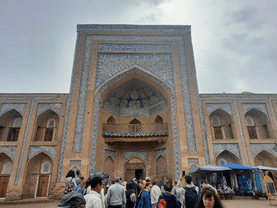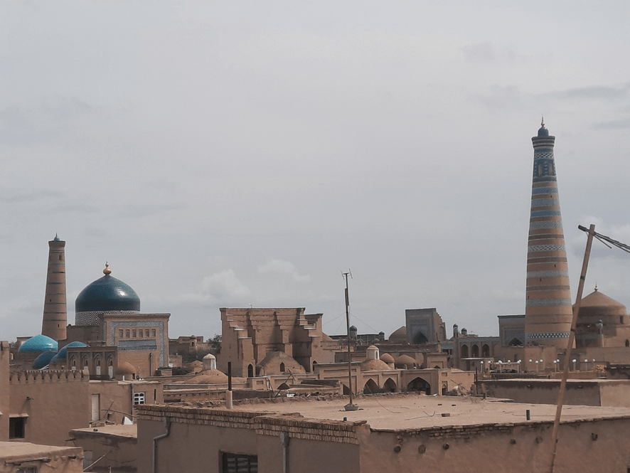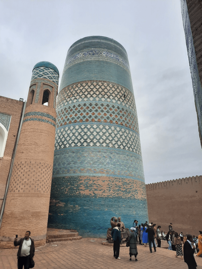 Mal adentramos na cidade, o minarete cuja construção não foi concluída logo chama atenção, porque sua forma assemelha-se mais a uma usina atômica, do que a uma construção cuja finalidade é avisar os horários de oração. Em que pese não ter sido finalizado, esse minarete, especialmente, encanta por ser totalmente coberto por azulejos. Ele foi planejado para ter 70m, mas ficou em 30 e poucos. Ainda assim, ele se destaca no horizonte urbano de Khiva.