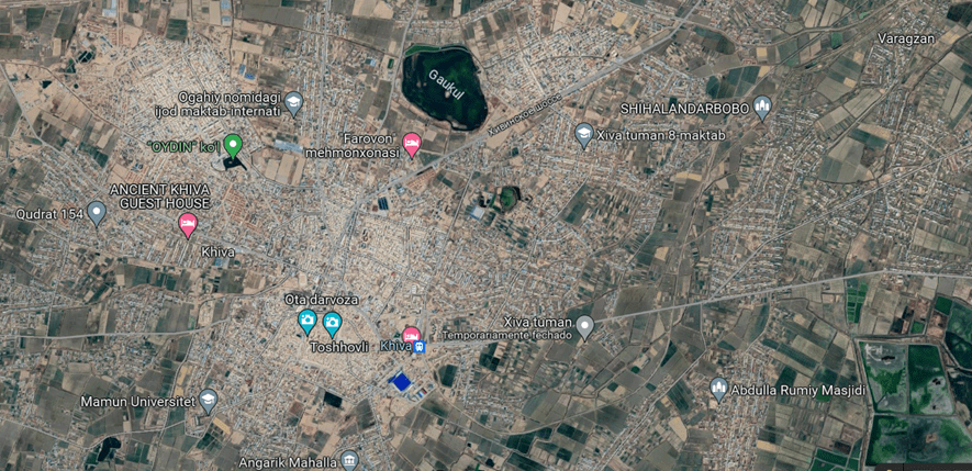As muralhas aparecem na imagem de satélite que se segue e se pode ver, na seguinte, que a cidade histórica ocupa uma parte pequena da Khiva atual.