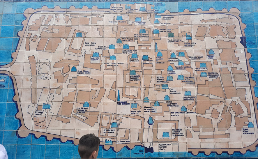 Começamos o percurso pelo grande painel, em que com os mesmos tipos de azulejo que utilizam para as mais lindas decorações uzbeques, eles representaram o mapa da cidade histórica. O difícil foi conseguir fazer uma fotografia sem que houvesse uma cabeça na frente dele.