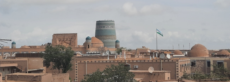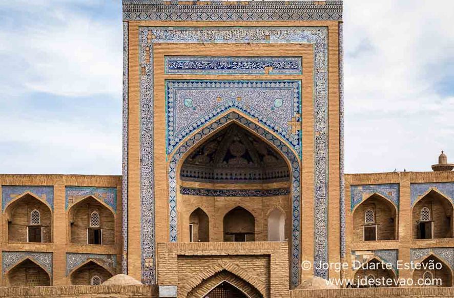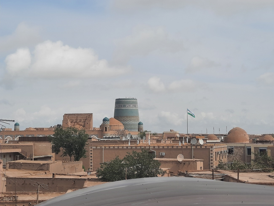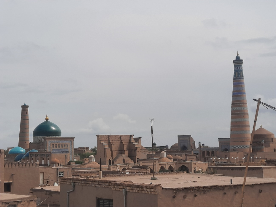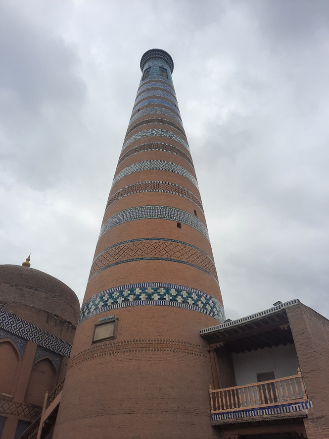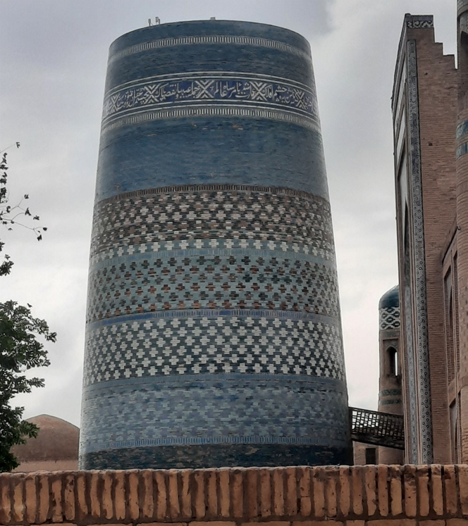 Mal adentramos na cidade, o minarete cuja construção não foi concluída logo chama atenção, porque sua forma assemelha-se mais a uma usina atômica, do que a uma construção cuja finalidade é avisar os horários de oração. Em que pese não ter sido finalizado, esse minarete, especialmente, encanta por ser totalmente coberto por azulejos. Ele foi planejado para ter 70m, mas ficou em 30 e poucos. Ainda assim, ele se destaca no horizonte urbano de Khiva.
