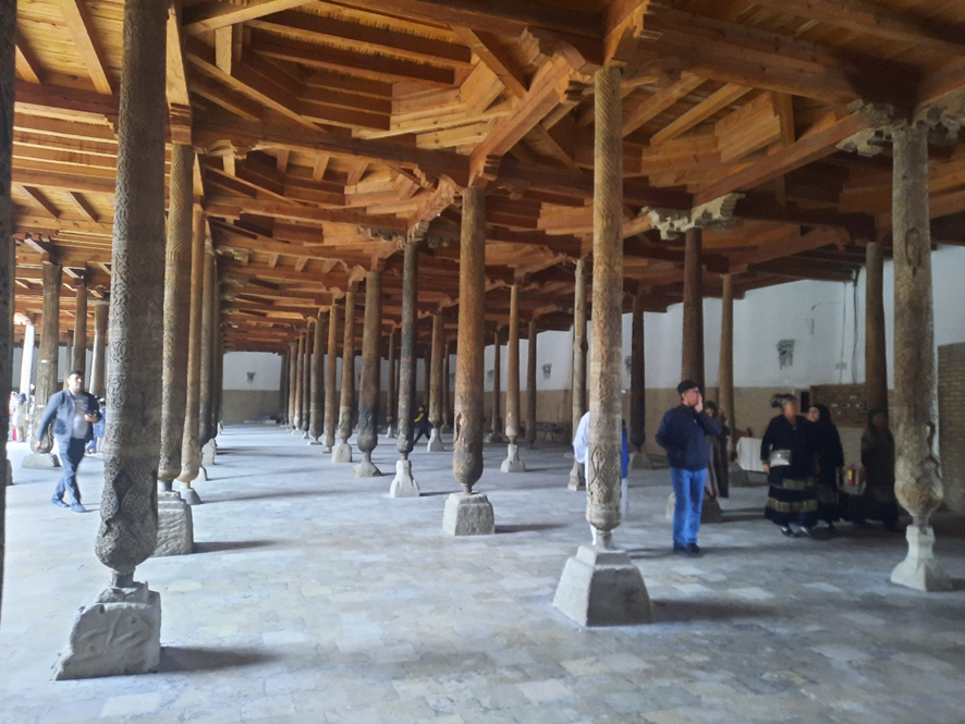 Destas colunas, apenas duas são originais, todas as demais são cópias dos registros que se tem das originais, que foram queimadas por Gengis Khan que, quando esteve em Khiva, no século XIII, colocou foto em quase tudo. Aliás, nem se pronuncia o nome deste senhor na cidade, tão desagradáveis são as lembranças que ele traz.