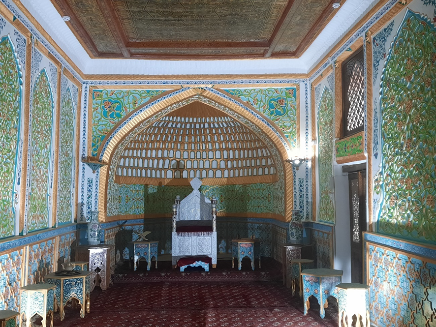 Outro ponto alto de Khiva é o Palácio Tach Khaouli, cujo nome significa “casa de pedra”. Foi construído entre 1832 e 1841 por ordem de Allah Kuli Kahn. O primeiro arquiteto que não conseguiu manter o cronograma previsto foi executado por ordem dele. O palácio tem 150 quartos e nove pátios interiores, mas visitamos apenas uma parte dele, a destinada ao harém de Allah Kuli Khan, e aquela onde está seu trono.
