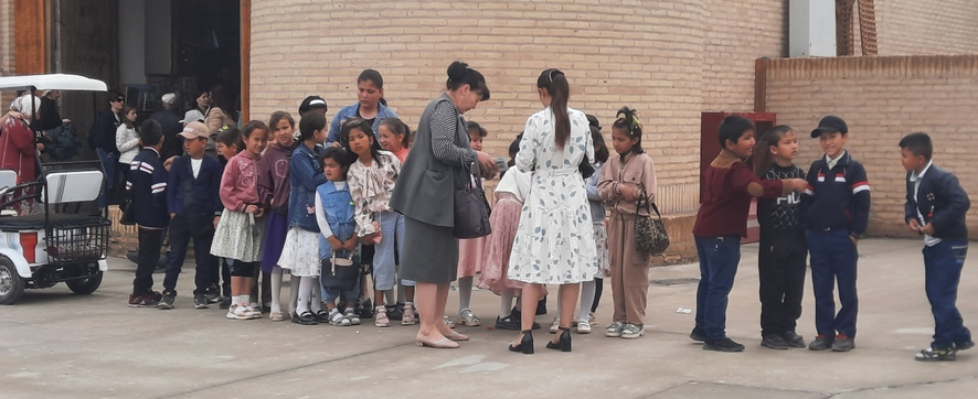 Como em vários endereços visitados no Uzbequistão, em Khiva, também estavam as professoras organizando seus alunos em fila para a visita a algum monumento.