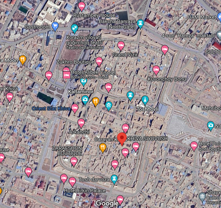 As muralhas aparecem na imagem de satélite que se segue e se pode ver, na seguinte, que a cidade histórica ocupa uma parte pequena da Khiva atual.