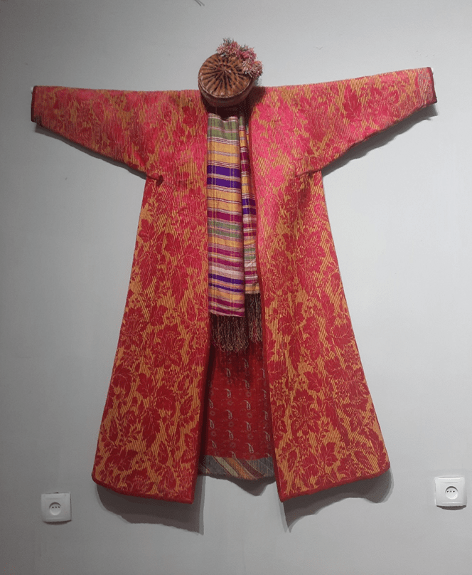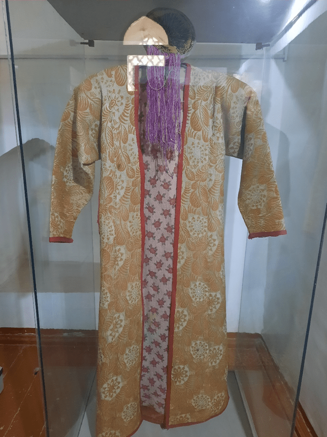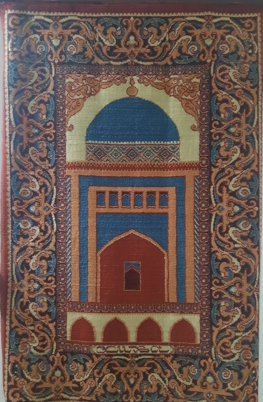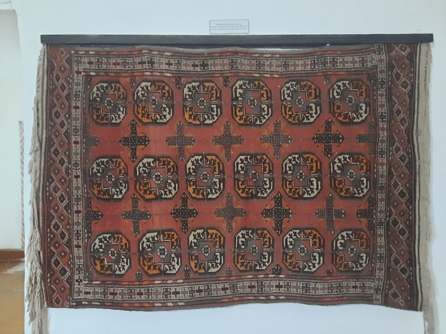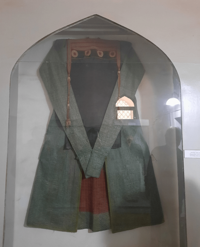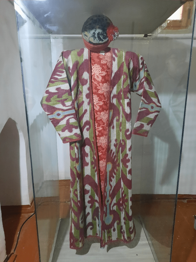 Na visita ao museu, que ocupa a construção que outrora havia funcionado como madraça, fiquei fascinada pelas roupas tradicionais dos uzbeques. Por mim, teria no grande mercado de Khiva comprado uma ou duas réplicas, mas, aqui entre nós, estava sendo reprimida para não exagerar com compras que, depois, não caberiam na bagagem. Meu gosto pela decoração de ambientes, sempre me faz imaginar que ficaria maravilhoso pendurar em exemplar destes na parede…