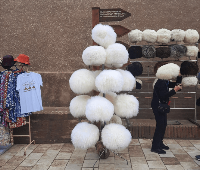 Como em todo mundo de influência árabe, não há clara distinção entre o espaço privado e o público, assim o comércio está por todo lado, em lojas, tendas, praças, ruas… Além das mercadorias que já havíamos visto em Tashkent, Samarqanda e Bukhara, aqui em Khiva chamou atenção a oferta de produtos resultantes da influência mongol e, mais recente russa, como os chapéus de pele que estavam expostos por todo lado.