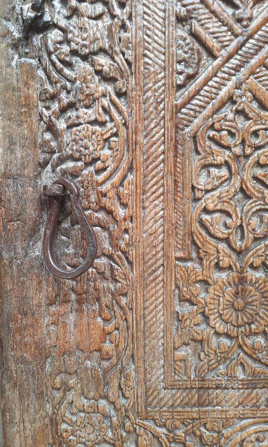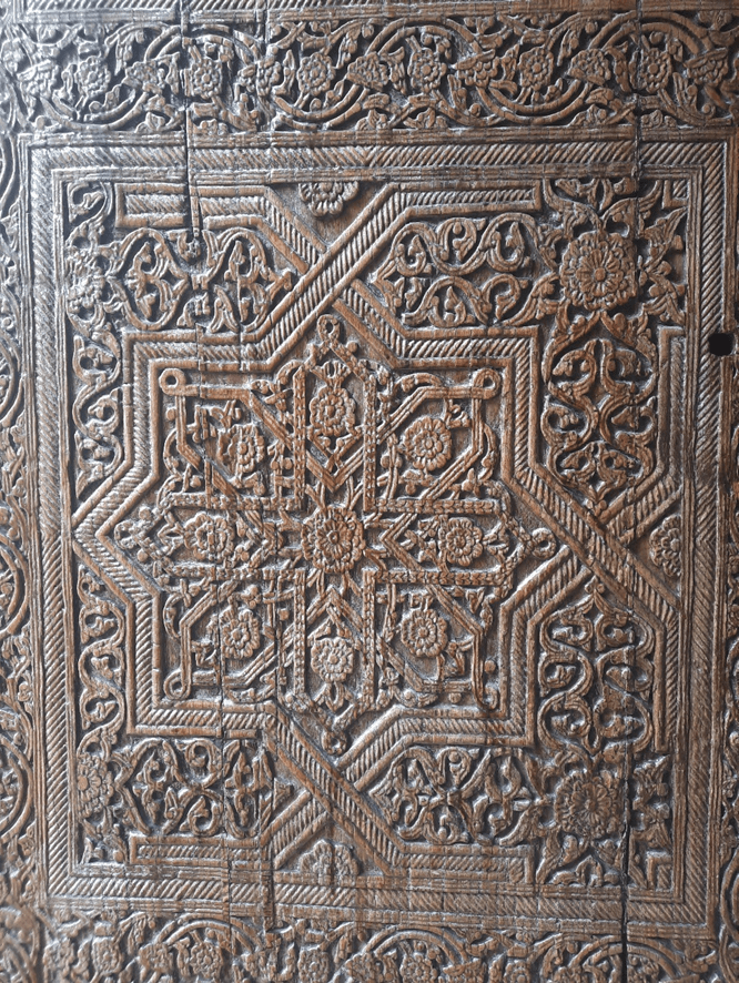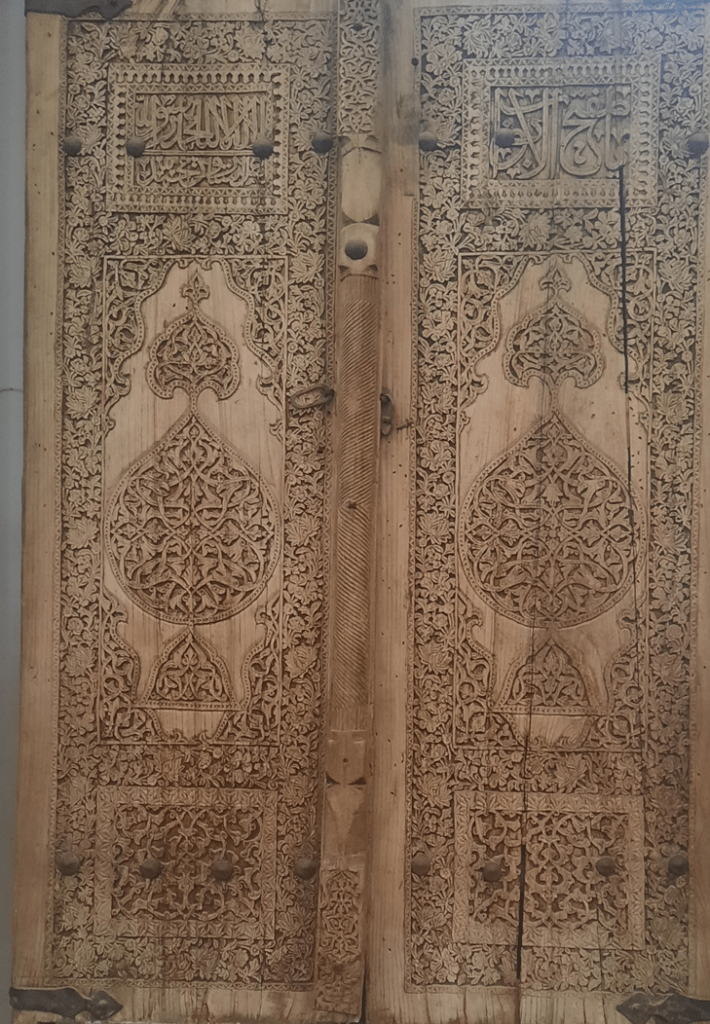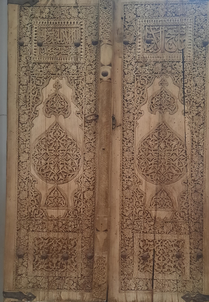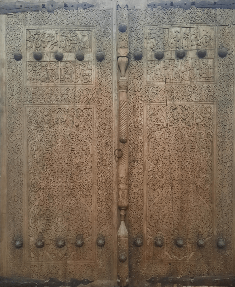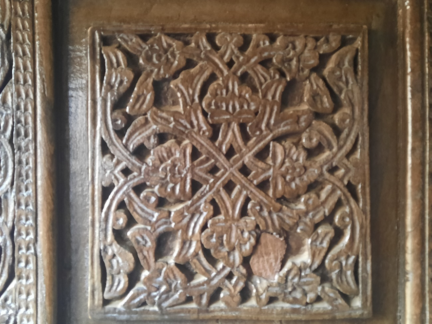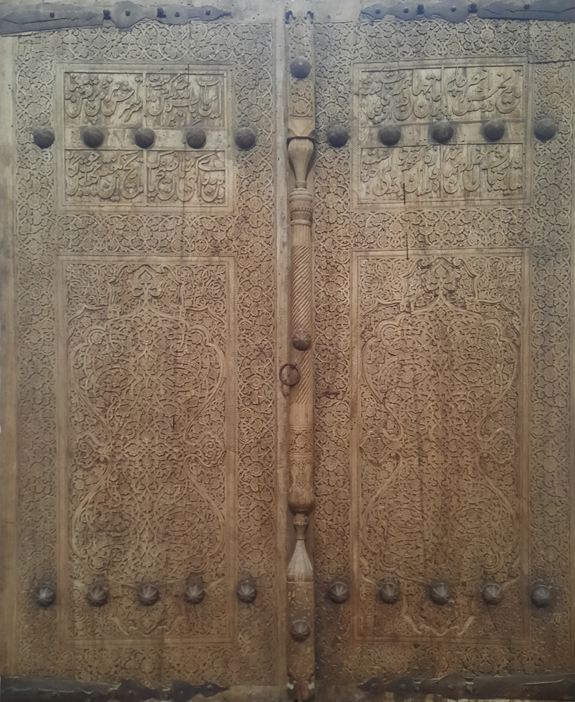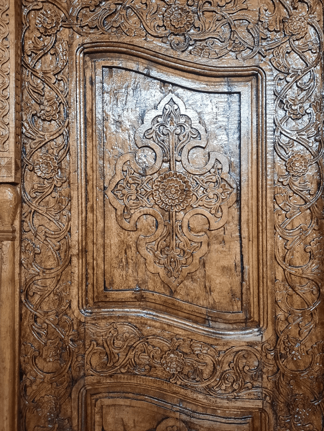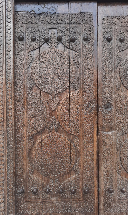 Em Khiva, registrei a maravilha dos sobre relevos nas portas em madeira. Foi explicado a nós que os uzbeques mantêm a madeira passando sempre azeite para lubrificar (vou fazer o mesmo nos objetos de madeira que eu tenho). Também disseram que os mais ricos tinham suas portas com uma única folha, porque era mais difícil de ser rompida e eu achando as de duas mais bonitas… Algumas entre essas portas têm mais de seis séculos.