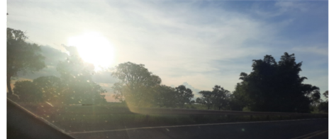 As chuvas de verão deixaram o cerrado mais verde que o comum e mesmo as extensas áreas de pastagens chamavam atenção pela planura do relevo que possibilitava uma visão de conjunto muito agradável. Saímos às 14h00 e o calor estava estonteante. Durante a maior parte do percurso, o termômetro do carro indicava que, do lado de fora do veículo, a temperatura era de 40 graus centígrados. Mesmo com o carro em movimento, arrisquei o registro fotográfico para mostrar o tamanho do sol.