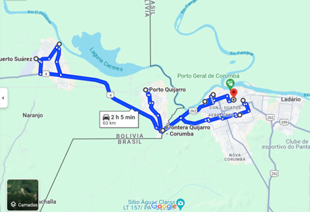 Eram 15h30. Desistimos de pegar a rodovia e voltamos para Corumbá, onde a reserva do Hotel Nacional nos foi valiosa. Vejam o mapa com os 65 km que percorremos atrás dos documentos e acrescentem mais 16 km, visto que não registrei a ida para fazer a reserva do hotel por volta das 11h da manhã.