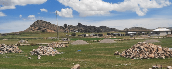 Por todo lado, há pedaços de rochas que devem rolar da cordilheira e que a população autóctone reúne para uso posterior. Há muitas divisões entre pequeníssimas propriedades feitas de muros de pedras, como há casas, cuja fundação tem esse material. Os fragmentos de rocha de tamanho médio também são usados para segurar os telhados, quando eles são de zinco ou alumínio, garantindo que não saiam voando, quando as rajadas de vento sopram.