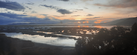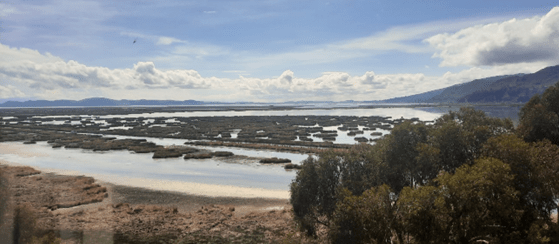 A vista do Lago Titicaca que tínhamos, a partir do nosso apartamento no hotel, estava deslumbrante no final do dia 13 de janeiro de 2024, quando chegamos. O sol se pondo, a água brilhando, e os tufos de junco flutuando.