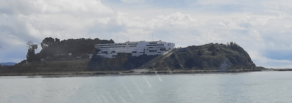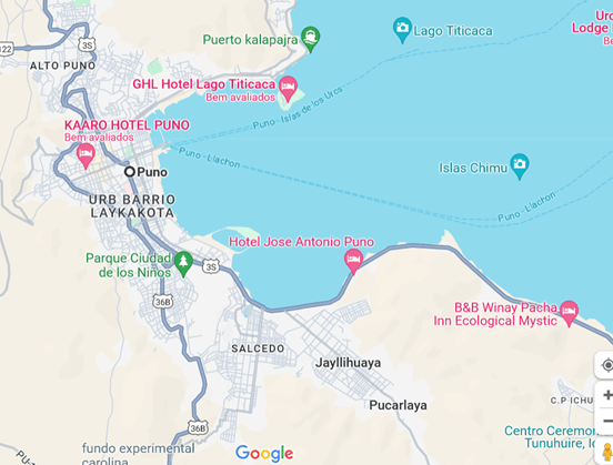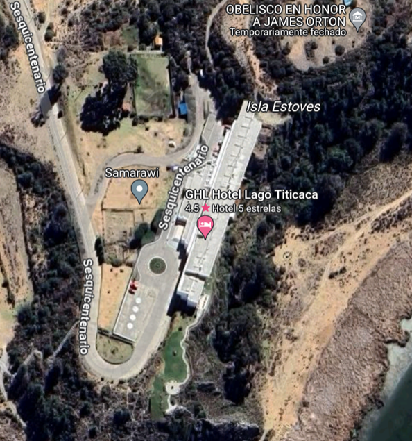 Observando o hotel de longe, achei que o arquiteto da edificação deve ter tido a intenção de fazê-lo parecer a um transatlântico. Essa forma possibilita que todos os apartamentos tenham vista para o lago. Da outra feita, ficamos num apartamento virado para a face da cidade. Agora estávamos observando a face que tem, ao fundo, as ocupações dos Uros, sobre as quais escrevo alguma coisa logo mais. Agora, vejam a localização do hotel numa pequena península ao norte da baía.