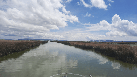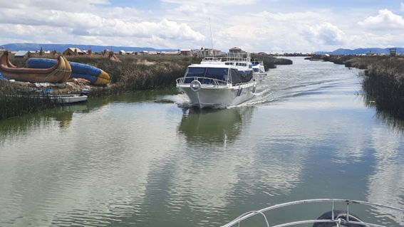Os barcos navegam em raias entre as fileiras de tufos de junco. Carlos explica que por causa do El Niño, o nível do lago baixou 1,5m e isso exigem que a navegação, nesta área perto de Puno, seja feita com mais cuidado. No centro do lago, esse 1,5m a menos não faz tanta diferença, mas nas margens sim.