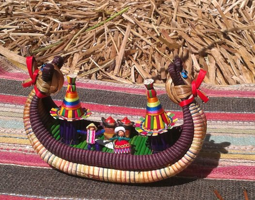 Da outra vez que fui a Uros comprei um pano preto, bordado em laranja e vermelho (parecido com este que está no colo da mulher à direita. Agora para não sermos simpáticos, ficamos um barquinho parecido com este abaixo, mas bem menos elaborado. É assim, no mundo da publicidade: as fotos e representações são mais espetaculares que a realidade.