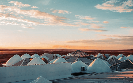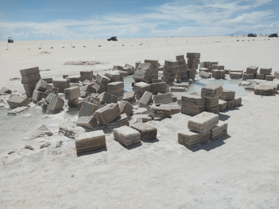 No entanto, aos poucos vamos vendo que, no salar, não há apenas o sal que restou da evaporação da água do Pacífico, mas também camadas de pó que o vento desértico joga sobre essa superfície. Essa sobreposição de camadas vai solidificando o material que está ali depositado e que, depois, pode ser recortado compondo verdadeiros blocos que funcionam como tijolos.