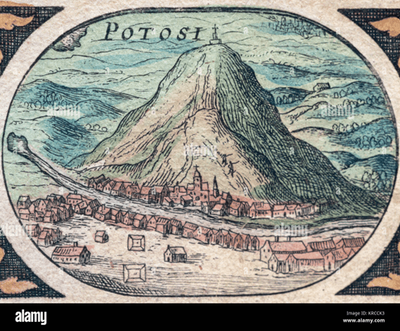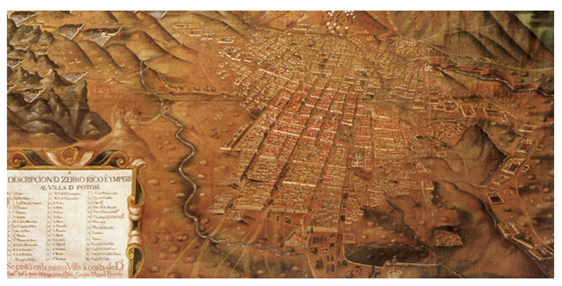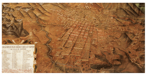 Em 1645, Potosi aparece numa representação holandesa como a principal fornecedora de prata do “Império Espanhol del Nuevo Mundo” e vejam o famoso cerro aí representado.