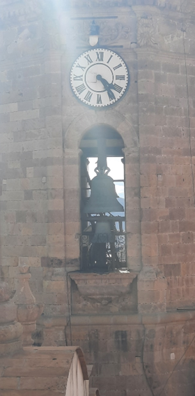 Na torre lateral, vê-se o relógio (marcador dos tempos do homem moderno) e os sinos (marcadores dos tempos pré-capitalistas no mundo ocidental). Estes são os que, atualmente, continuam a badalar, mas já sincronizados a um sistema automático. Bem menores, lá estão eles para dizer que a Igreja ainda conta.